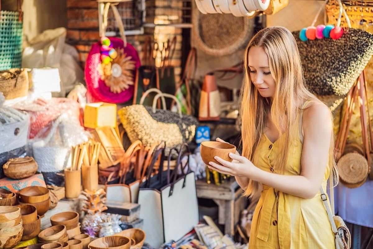 Ada banyak pilihan oleh-oleh khas Bali, seperti patung, ukiran, tas dari anyaman, topi, dan produk lainnya yang dibuat secara handmade.