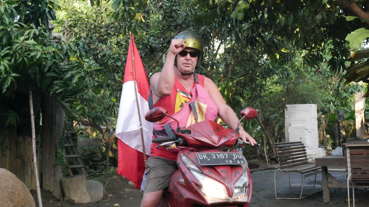 BENDERA – Gary, Bule Inggris yang bangga memasang bendera Merah Putih pada sepeda motornya. (Foto: Ag/GM)
