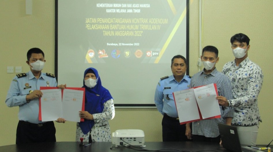 Foto: Penandatangan Kontrak Addendum Pelaksanaan Bantuan Hukum Triwulan IV 2022 untuk 17 PBH Jatim di Kantor Kemenkumham Jatim, Selasa (22/11/2022). (hms/kumham/jatim)