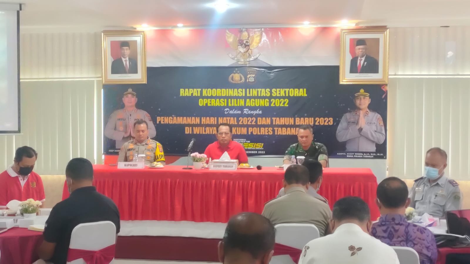 Tabanan | barometerbali – Komandan Kodim (Dandim) 1619/Tabanan Letkol Inf Riza Taufiq Hasan, S.I.P., menghadiri rapat koordinasi lintas kementerian dan lembaga dalam rangka pengamanan perayaan Natal tahun 2022 dan tahun baru 2023 (Nataru). di Aula Wisnu Hartono Polres Tabanan Jalan Pahlawan No.12, Desa Delod Peken Kecamatan Tabanan, Jumat, (16/12/2022).