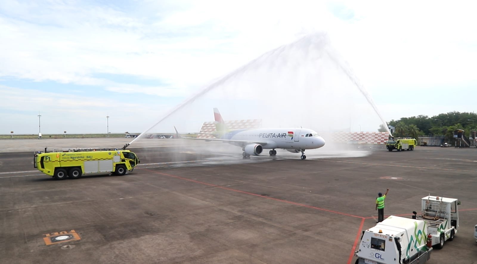 Foto: Pelita Air Service 6D102 mendarat di Bandara Internasional I Gusti Ngurah Rai – Bali disambut dengan seremonial Water Salute, Kamis (28/4/2022) pukul 12.11 Wita (BB/ap1)