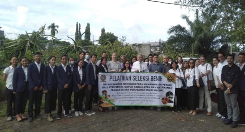 Foto bersama usai FP Unud pada Senin, 9 Januari 2023 menerima bantuan alat seleksi benih dari PT AQUA TIR Indonesia dan PT Fadeev Agro dari Rusia bertempat di KPFP Unud Pegok, Denpasar. (ftp/unud)