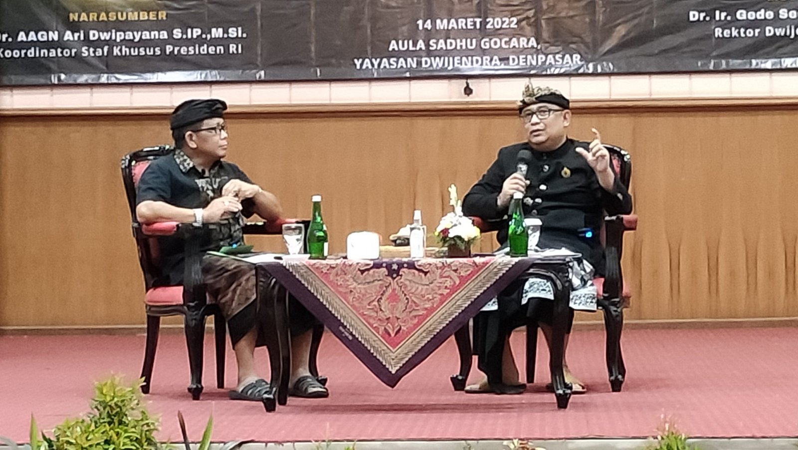 Denpasar | barometerbali – Koordinator Staf Khusus Presiden RI, Dr AAGN Ari Dwipayana, SIP, MSi menyampaikan kuliah umum dengan mengambil tema “Toya Uriping Bhuwana, Usadhaning Sangaskara”, yang artinya Air Sumber Kehidupan dan Penyembuh Peradaban di Universitas Dwijendra, Denpasar, Senin, (14/3/2022).