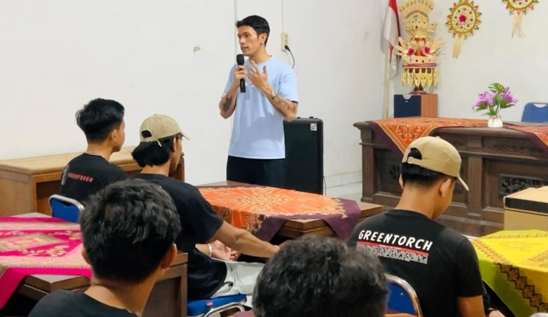 Foto: Agung Bagus Arsadhana Linggih (Arsa Linggih) berdiskusi dan berbagi tips tata cara mengelola organisasi kepada puluhan pengurus Sekaa Teruna Teruni Eka Yowana Shanti Banjar Kangin Desa Selisihan, Klungkung, Jumat (8/12/2023). (Sumber: Dok pribadi)