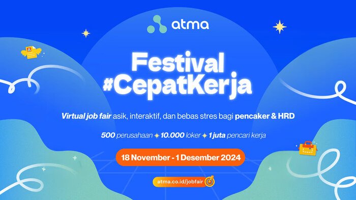Menyambut akhir tahun 2024, platform social job portal Atma menggelar acara virtual job fair bertema Festival #CepatKerja dari tanggal 18 Nov – 1 Des 2024 demi membantu perusahaan & bisnis untuk memenuhi kebutuhan SDM yang memuncak menjelang Natal & Tahun Baru, serta pencari kerja yang masih belum kunjung mendapatkan pekerjaan. Ada sekitar 500+ perusahaan & bisnis yang berpartisipasi dari industri F&B, retail, perhotelan, e-commerce, serta manufaktur, dengan belasan ribu loker yang siap menyerap tenaga kerja. Info lengkap bisa dicek di sini.