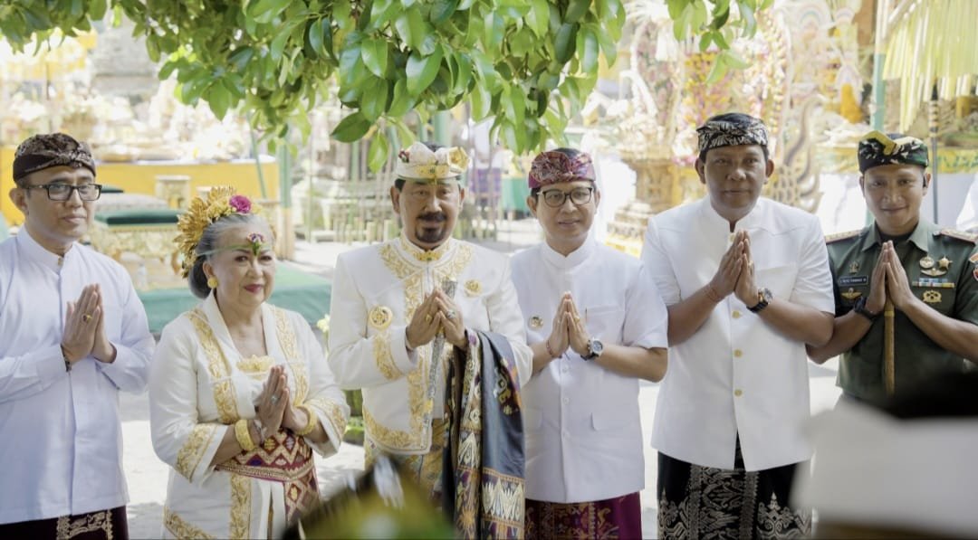 Barometer Bali | Badung – Bupati Badung I Wayan Adi Arnawa didampingi Nyonya Rasniathi Adi Arnawa, bersama Wakil Bupati Badung Bagus Alit Sucipta mengikuti upacara sakral Penobatan Bhiseka Panglingsir Puri Ageng Mengwi, Anak Agung Gde Agung bersama istri sebagai Ida Cokorda Mengwi XIII di Pura Taman Ayun Mengwi, Senin (7/7/2025).