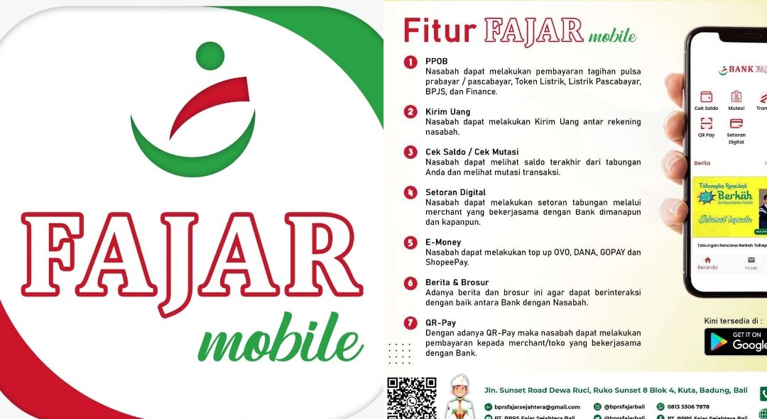 Pada Selasa, 23 Agustus 2022 kemarin Bank Fajar telah mendapatkan izin dari Otoritas Jasa Keuangan (OJK) terkait dengan penggunaan produk lanjutan berbasis tekhnologi informasi berupa Mobile Banking BPRS Fajar Sejahtera Bali. M-Banking Fajar Mobile ini sudah dapat diakses di Playstore.