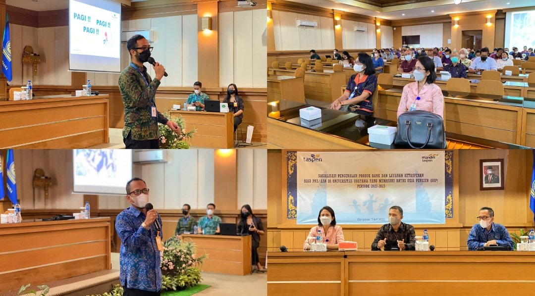 Kolase Foto: Bank Mandiri Taspen saat menyampaikan info produk dan kemudahan bagi para pensiunan Unud (hms/unud)