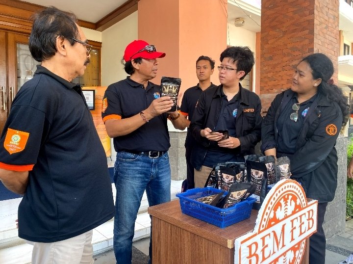 Denpasar | barometerbali – Tim Program Penguatan Kapasitas Organisasi Kemahasiswaan (PPK Ormawa) Badan Eksekutif Mahasiswa Fakultas Ekonomi dan Bisnis Universitas Udayana (BEM FEB Unud) berkolaborasi dengan Divisi III Bidang Kewirausahaan BEM FEB Unud untuk membangun branding awareness produk sekaligus menjual produk Wedang Karsa pada stand BEM di Ajang Dies Natalis FEB ke-56, Sabtu (2/9/2023).