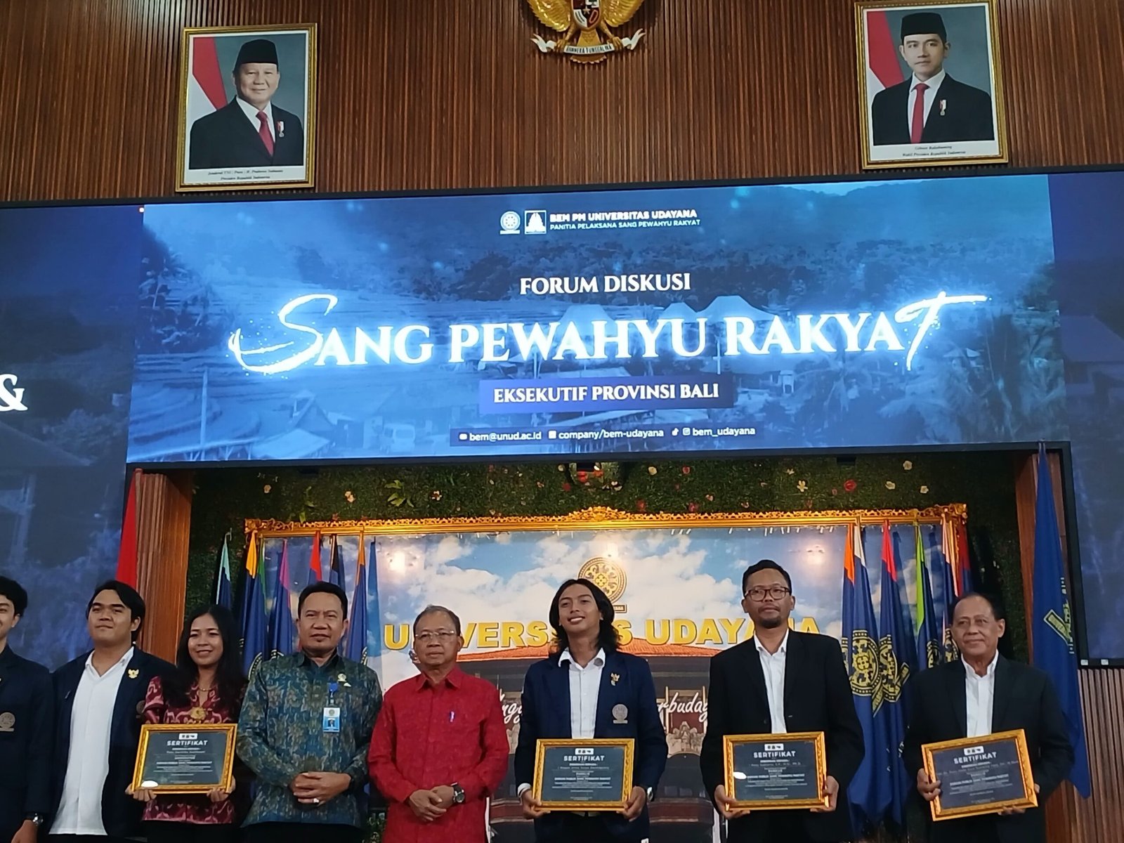 Barometer Bali | Denpasar – Badan Eksekutif Mahasiswa (BEM) Universitas Udayana memberikan sorotan kritis terhadap kebijakan Gubernur Bali Wayan Koster dan Wakil Gubernur I Nyoman Giri Prasta melalui dialog terbuka bertajuk Sang Pewahyu Rakyat. Kegiatan ini digelar di Auditorium Widya Sabha Universitas Udayana, Rabu (18/2/2026), dengan tema “Menelisik Bali dalam Dua Dunia: Antara Etika dan Kapitalistik”.