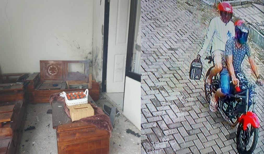 Foto: Rumah petugas Lapas Malang (kiri) dilempar “bom” jenis rakitan berjenis bondet yang berisi kelereng dan kerikil membuat kerusakan teras rumah oleh dua orang tak dikenal mengendarai sepeda motor (kanan) di daerah Pakis, Kabupaten Malang, Senin (24/10/2022). (ist/tangkapan layar CCTV)