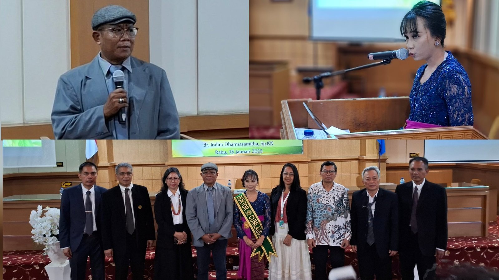 Kolase foto: dr. Indira Dharmasamitha, Sp.D.V.E berhasil meraih gelar Doktor Pertama lewat Metode Riset dengan Predikat Cumlaude dalam Ujian Promosi Doktor dengan disertasi berjudul “Pengembangan Emulgel Ekstrak Andrographolid sebagai Pengobatan Topikal pada Psoriasis” berlangsung di Gedung Pascasarjana Unud, Rabu (15/1/2025). (barometerbali/213)