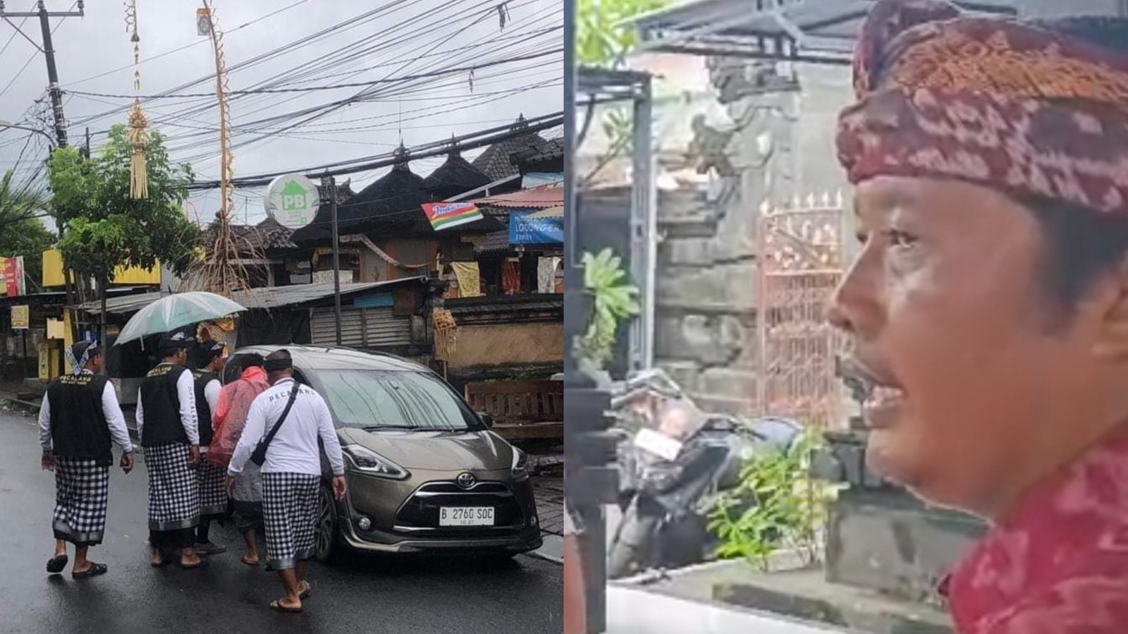 Foto: Mobil yang digunakan keluar oleh wanita diduga Ratna Sarumpaet bersama sopirnya saat hari suci Nyepi Saka 1946 dihentikan pacalang di depan kantor LPD Desa Adat Tandeg, Jalan Pantai Berawa nomor 93, Tibubeneng, Badung, Bali (kiri) dan Bandesa Adat Tandeg Wayan Wartana (kanan) saat ditemui di Pura Desa Desa Adat Tandeg, Selasa (12/3/2024). (Sumber: BB/istimewa)