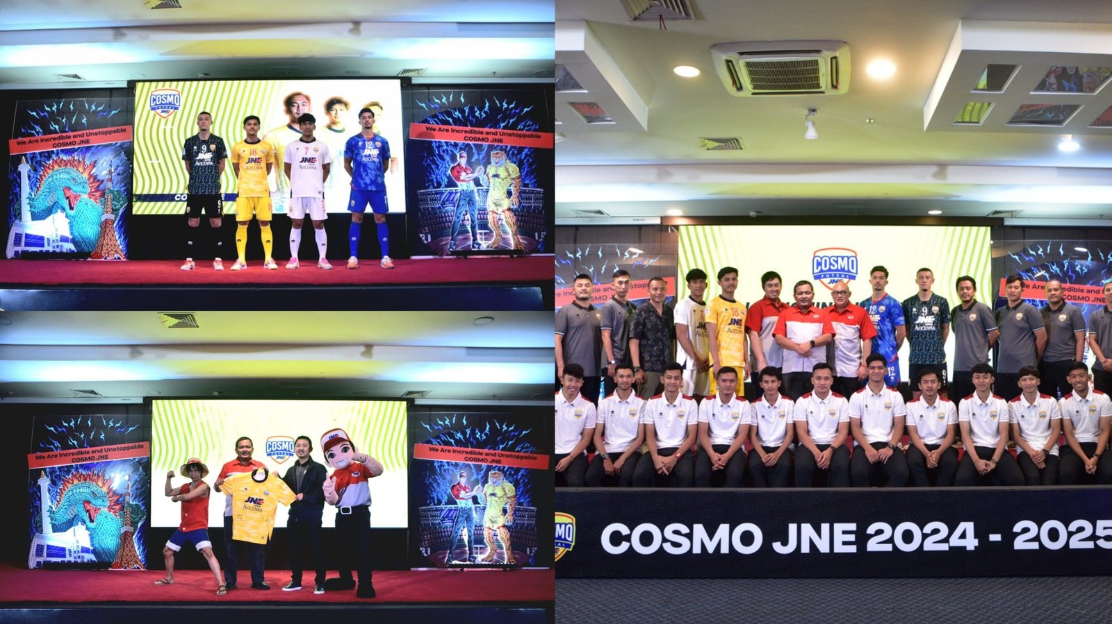 Kolase foto: Foto bersama jajaran manajemen JNE dan para pemain Cosmo JNE 2024/2025 dalam acara launching official jersey dan pemain baru Cosmo JNE FC, dilanjutkan penandatanganan official jersey Cosmo JNE bersama Eri Palgunadi selaku SPV – Marketing Group Head JNE dan Shendy Leonardi selaku Co-Founder Tim Cosmo JNE, di Ballroom Kantor Pusat JNE, Selasa (10/12/2024). (barometerbali/213/wdn)
