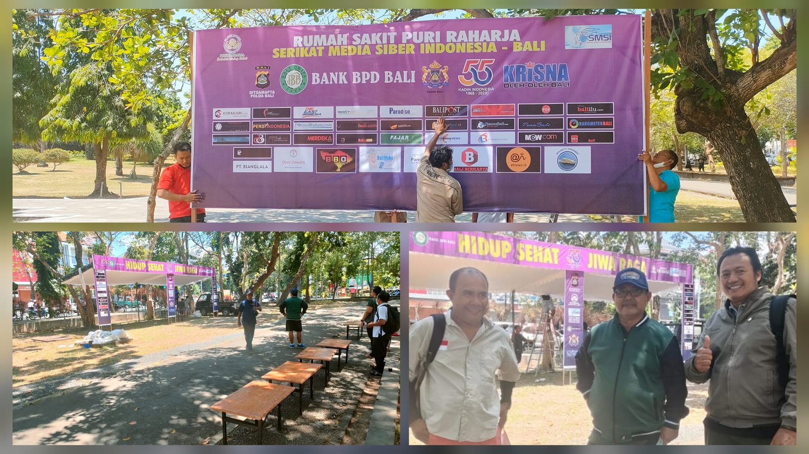 Kolase foto: Panitia saat lakukan persiapan terakhir acara Baksos Kesehatan SMSI Bali dan RSU Puri Raharja di Lapangan Niti Mandala, Renon, Denpasar, Sabtu (23/9/2023)