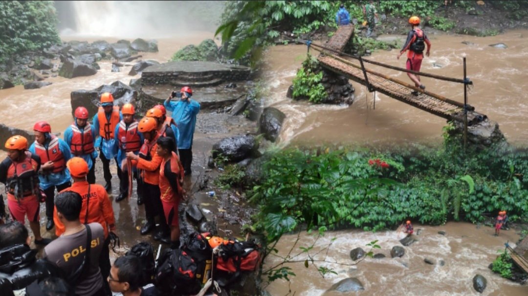 Kondisi cuaca di lokasi hujan deras, sehingga mengakibatkan debit air meningkat. Tim SAR gabungan berupaya melakukan pencarian di seputaran air terjun dan aliran ke hilir.