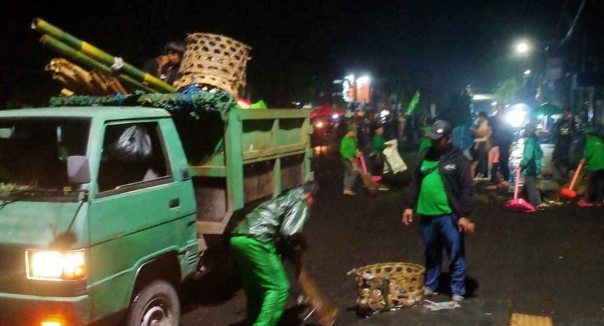 Foto: Tenaga Kebersihan DLHK Kota Denpasar saat bertugas usai Pengarakan Ogoh-ogoh Malam Pangerupukan serangkaian Nyepi Caka 1946 di Kota Denpasar, Senin (11/3/2024) dini hari. (Sumber: BB/ags/hmsdps).