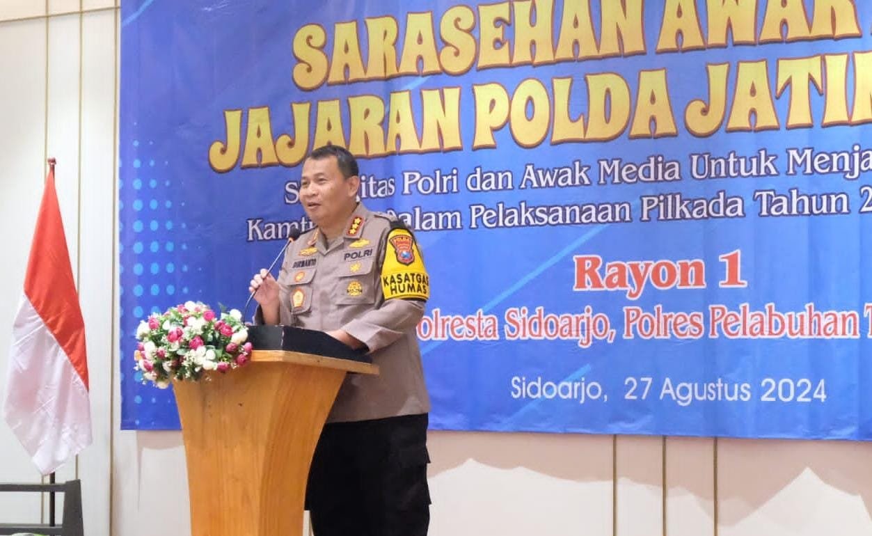 Kombes Pol Dirmanto juga menyampaikan pentingnya sinergi antara Polri dan awak media dalam menjaga kondusifitas pelaksanaan Pilkada tahun 2024 di Jatim.