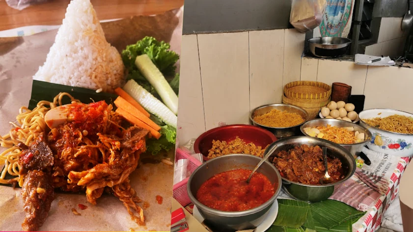 Isinya antara lain nasi putih, mie goreng kuning, suwiran ayam, dan pelengkap seperti tempe goreng, kacang goreng, dan telur rebus.
