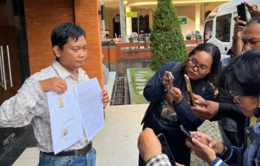 Ket foto: Panitia melaporkan tindak pidana oleh ormas dalam The People’s Water Forum (PWF) dan mendesak pengusutan aktor negara yang memobilisasi pembubaran dan kekerasan, di Polda Bali, Selasa, (28/5/2024). (Sumber: BB/Rian)