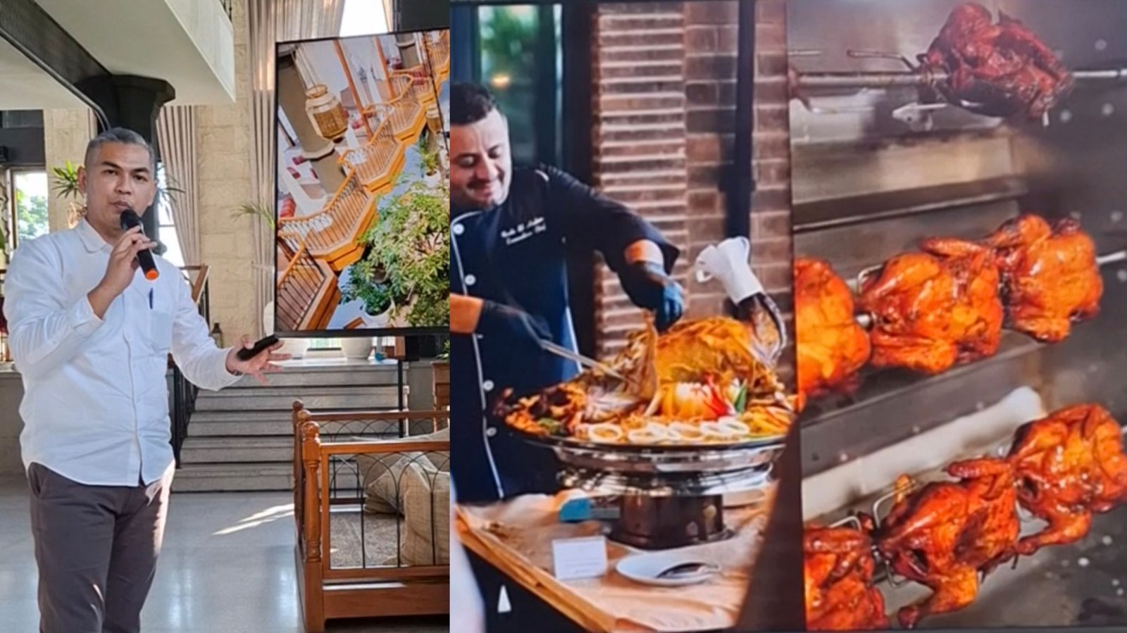 Kolase foto: Chief Manager Al Jazeerah Signature Restaurant & Lounge Rei Patriani menjelaskan profil restorannya dan menu kambing duduk dengan chef dari Lebanon di acara media gathering dan buka puasa bersama di Seminyak, Kuta, Senin (3/3/2025). (barometerbali/rian)