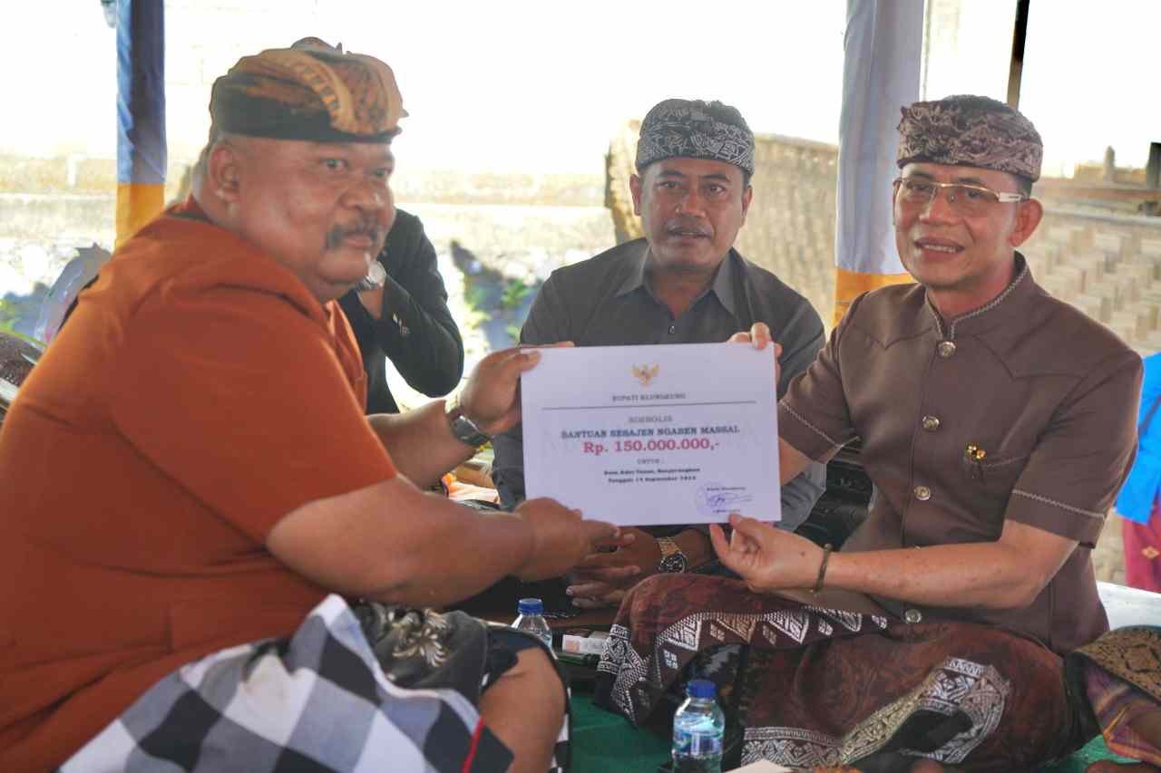 Bupati Satria menyerahkan Punia sesajen ngaben massal sebesar Rp 150 juta rupiah. Program bantuan ngaben massal bertujuan untuk menunjukkan dukungan pemerintah terhadap kelestarian adat dan budaya, serta meringankan beban masyarakat melalui partisipasi dan bantuan.