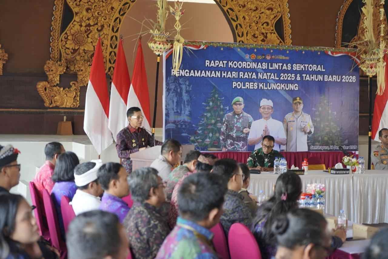 Barometer Bali | Klungkung – Bupati Klungkung, I Made Satria menghadiri Rapat Koordinasi (Rakor) Lintas Sektoral bersama Kapolres, Dandim 1610/Klungkung, Forkompinda serta OPD terkait dalam rangka mempersiapkan Pengamanan jelang Hari Raya Natal 2025 dan Tahun Baru 2026 di Gedung Aula Kantor Polres Klungkung, Selasa (16/12).