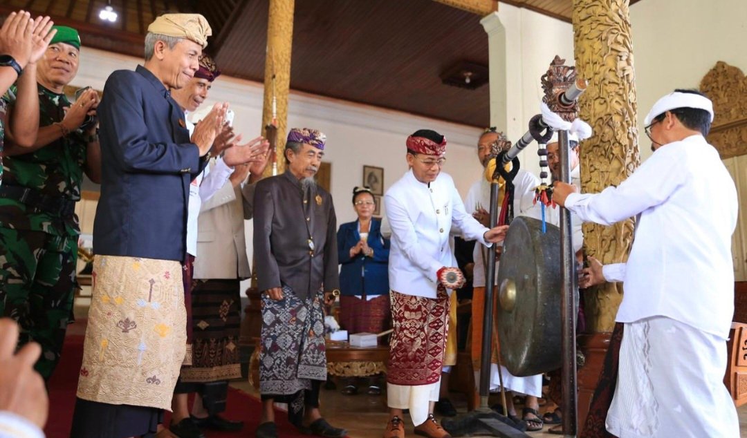 Bupati Klungkung I Made Satria membuka secara resmi Pesamuan Agung Pasemetonan Ageng Trah Arya Kuthawaringin ditandai pemukulan gong di Puri Agung Klungkung, Sabtu (26/9/2025).