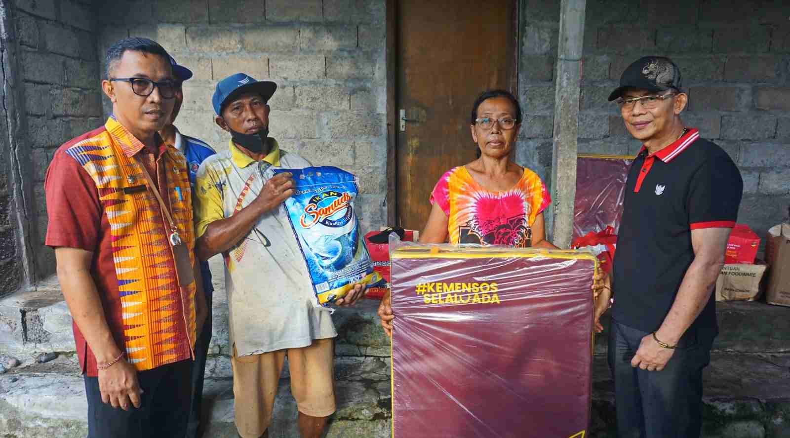 Bantuan berupa sembako, peralatan dapur, kasur, selimut dan makanan siap saji diserahkan kepada I Nyoman Sudira dan Kade Wati korban bencana longsor rumahnya tergerus aliran sungai.