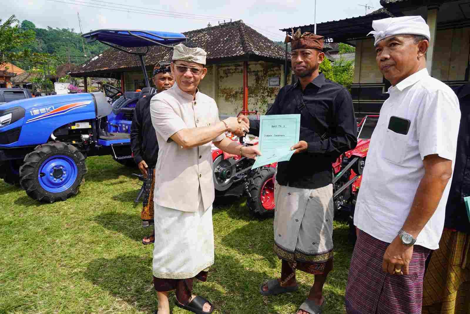 Bantuan berupa Traktor Roda Dua Tipe Rotary diserahkan kepada Kelompok Tani Arta Sedana Swadiri, Desa Selisihan, Kecamatan Klungkung, Subak Selat, Desa Selat, Kecamatan Klungkung, Subak Tegehan, Desa Takmung, Kecamatan Banjarangkan, Subak Delod Banjarangkan, Desa Banjarangkan, Kecamatan Banjarangkan, dan Subak Semaagung, Desa Tusan, Kecamatan Banjarangkan.