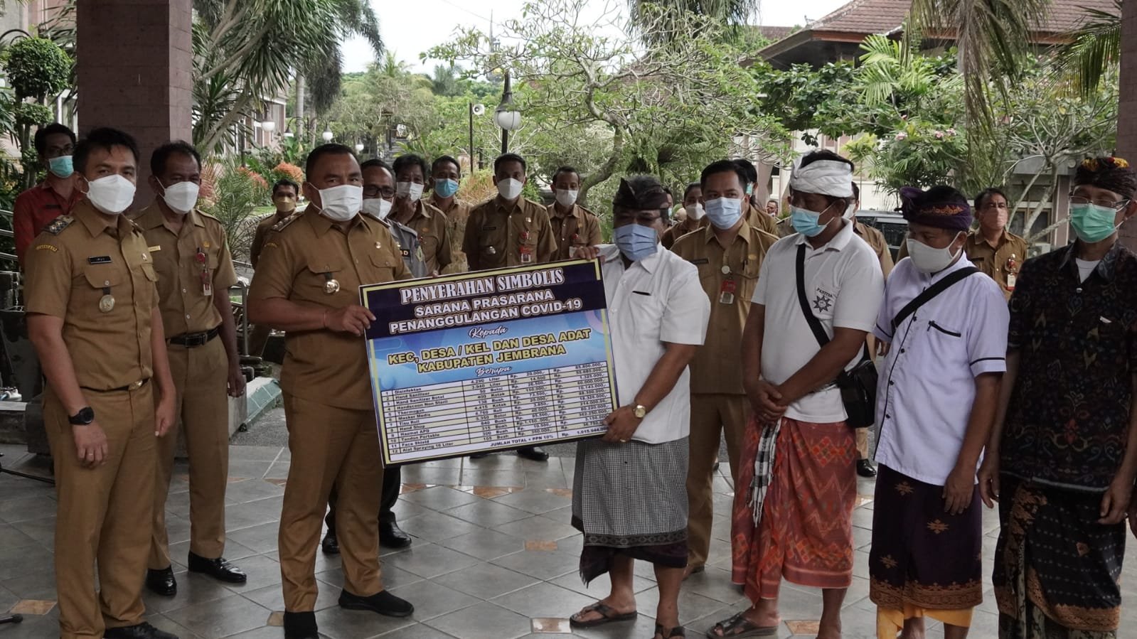 Penyerahan sarana dan prasarana kesehatan penanganan Covid-19 diterima langsung oleh Majelis Adat Desa Pakraman serta para camat se-Kabupaten Jembrana.