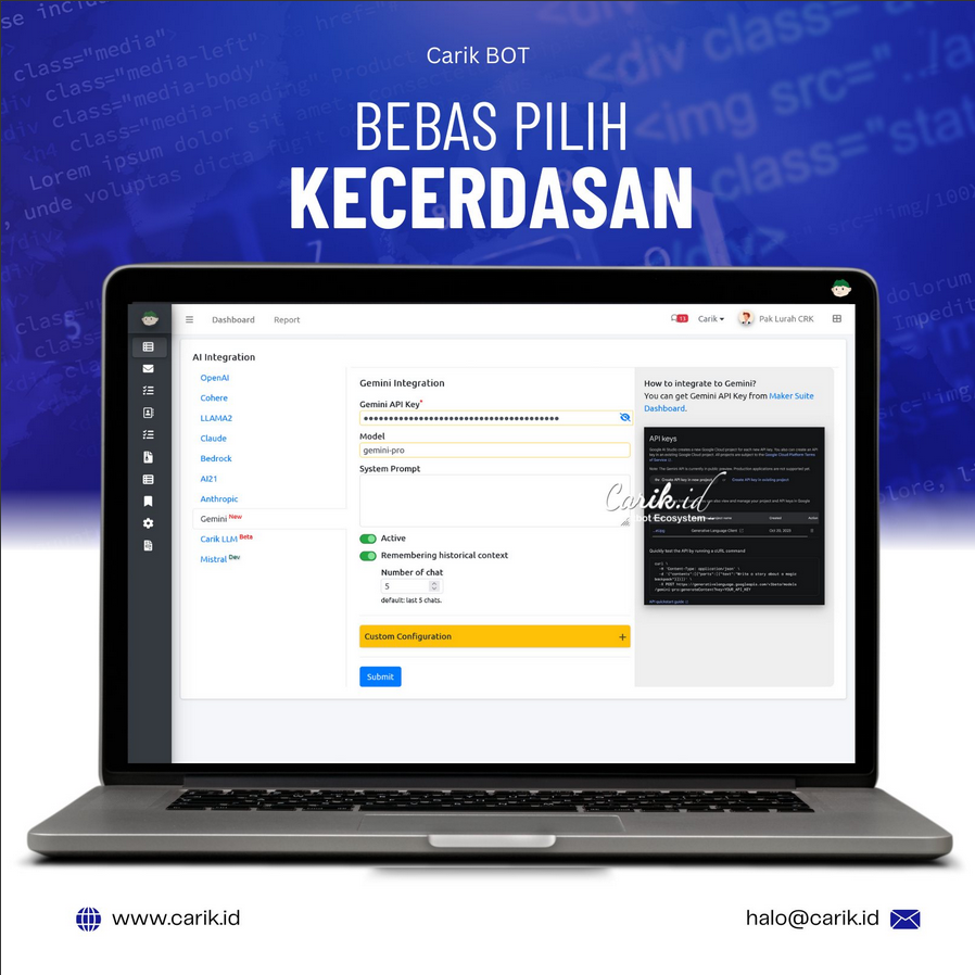 Semarang, 20 Mei 2024 — Sebagai pelopor di bidang chatbot open-source di Indonesia, Carik Teknologi Cerdas dengan bangga meluncurkan layanan terbaru mereka, Intelligence Dashboard. Layanan ini dirancang untuk memudahkan pengguna dalam memilih model LLM (Large Language Model) yang tepat guna meningkatkan kecerdasan asisten digital, khususnya untuk layanan pelanggan.