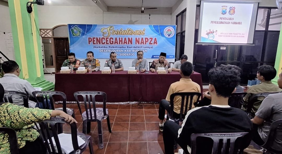 Barometer Bali | Sidoarjo – Guna menangkal maraknya penyalahgunaan narkoba, minuman keras (miras), dan kenakalan remaja di kalangan generasi muda, Polsek Buduran menggelar kegiatan sosialisasi pencegahan dan pemberantasan narkoba pada Senin malam, 14 Juli 2025, bertempat di Kantor Desa Buduran, Kecamatan Buduran, Kabupaten Sidoarjo.