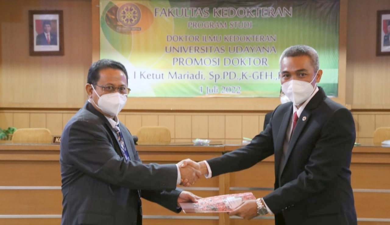 Ket foto: Dr. dr. I Ketut Mariadi, Sp.PD., K-GEH., FINASIM dinyatakan lulus sebagai Doktor Lulusan ke- 349 Program Studi Doktor Ilmu Kedokteran Fakultas Kedokteran Universitas Udayana dengan predikat Sangat Memuaskan (Cumlaude).