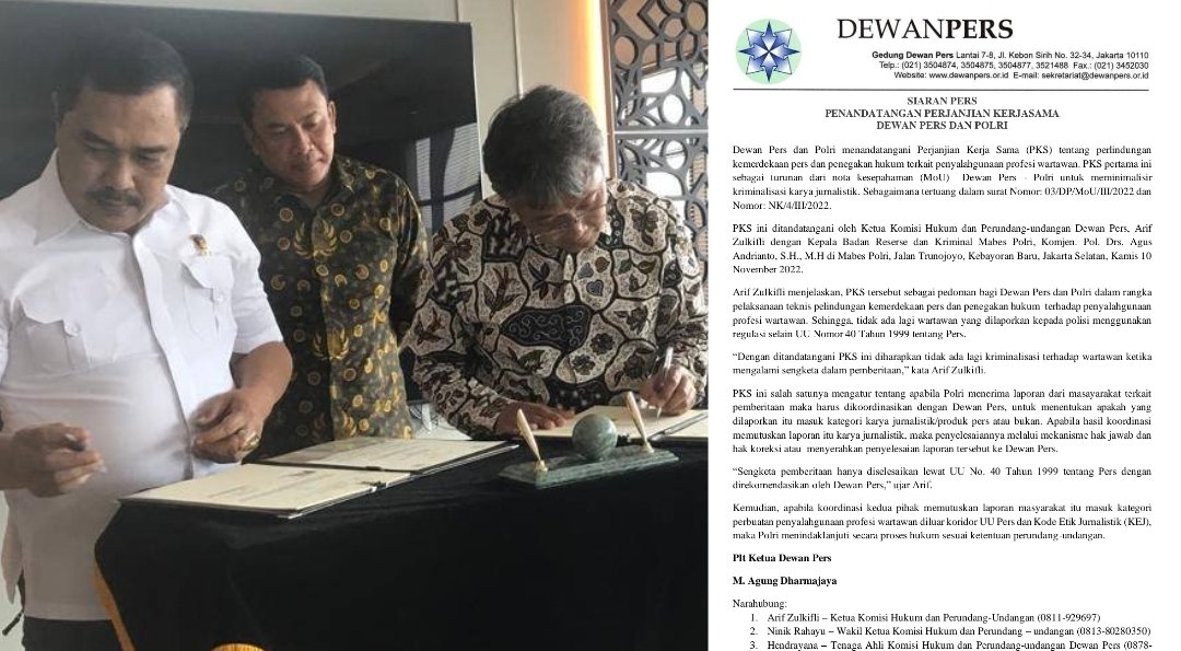 PKS pertama ini sebagai turunan dari nota kesepahaman (MoU) Dewan Pers-Polri sebagaimana tertuang dalam surat Nomor: 03/DP/MoU/III/2022 dan Nomor: NK/4/III/2022, yang ditandatangani oleh Arif Zulkifli Ketua Komisi Hukum dan Perundang-Undangan Dewan Pers, dengan Komjen Pol Agus Andrianto Kepala Badan Reserse dan Kriminal (Bareskrim) Mabes Polri di Mabes Polri, Jakarta Selatan, Kamis (10/11/2022).