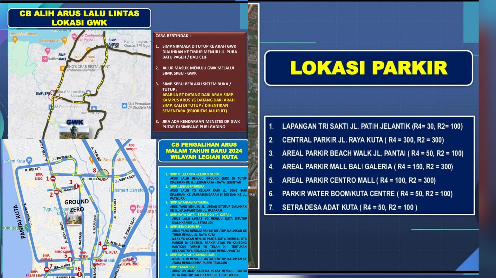 “Pada malam pergantian tahun akan dilaksanakan pengalihan arus lalu lintas mengantisipasi kepadatan kegiatan masyarakat yang akan merayakan momen akhir tahun 2023. Titik-titik seperti di obyek wisata GWK akan dilakukan pengalihan arus lalin pada simpang Nirmala, arus lalu lintas dari Uluwatu menuju GWK akan ditutup, kemudian akan dialihkan ke arah timur menuju Jalan Pura Batu Pageh ke arah Jalan Dharmawangsa,” papar Kombes Pol Avitus Panjaitan, Kabid Humas Polda Bali.