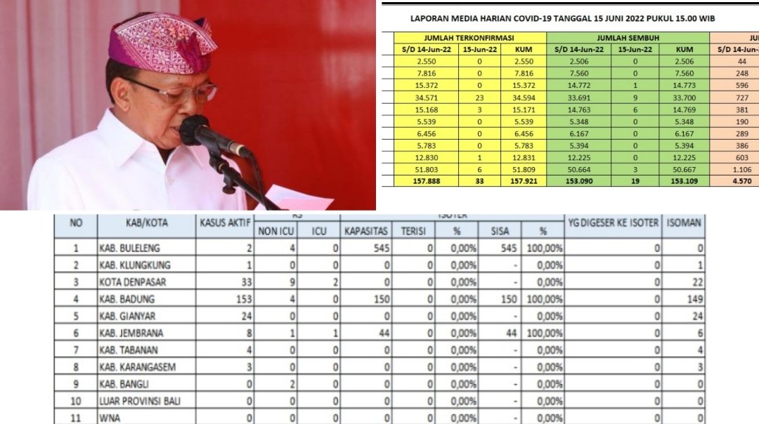 Kolase foto Gubernur Bali Wayan Koster dan Laporan Harian Perkembangan Covid-19 (BB/ist)