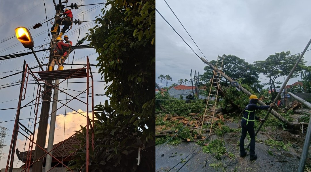 Petugas PLN tengah memperbaiki gangguan pada jaringan akibat pohon tumbang dan tiang jatuh (Kolase: Hms/PLN/Ala)