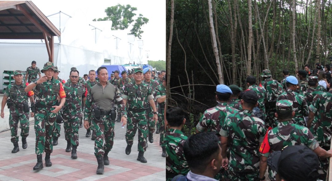 Panglima TNI Jenderal TNI Andika Perkasa didampingi para Dansatgas dan pejabat terkait memastikan pengamanan di Venue Kawasan Tahura Mangrove Ngurah Rai, Areal Pura Candi Narmada, Desa Pemogan, Kecamatan Denpasar Selatan, pada Jumat (11/11/2022).