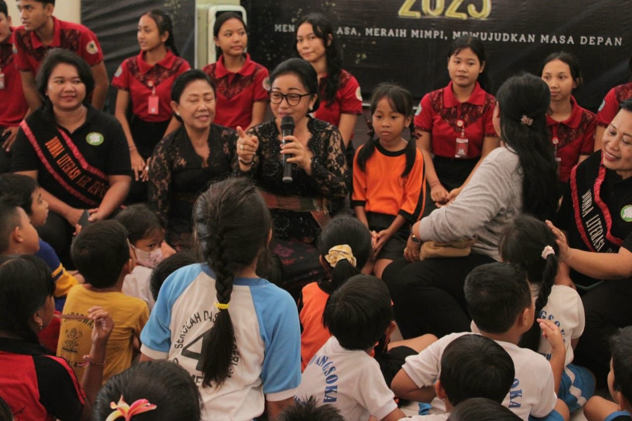 Foto: Bunda Literasi Kota Denpasar, Ny. Antari Jaya Negara didampingi Ketua DWP Kota Denpasar, Ny. Ida Ayu Widnyani Wiradana saat berinteraksi dengan para siswa dalam kegiatan Gebyar Literasi Kecamatan Denpasar Timur, di kawasan SKB Penatih, Sabtu (11/5/2024). (Sumber:BB/Win).