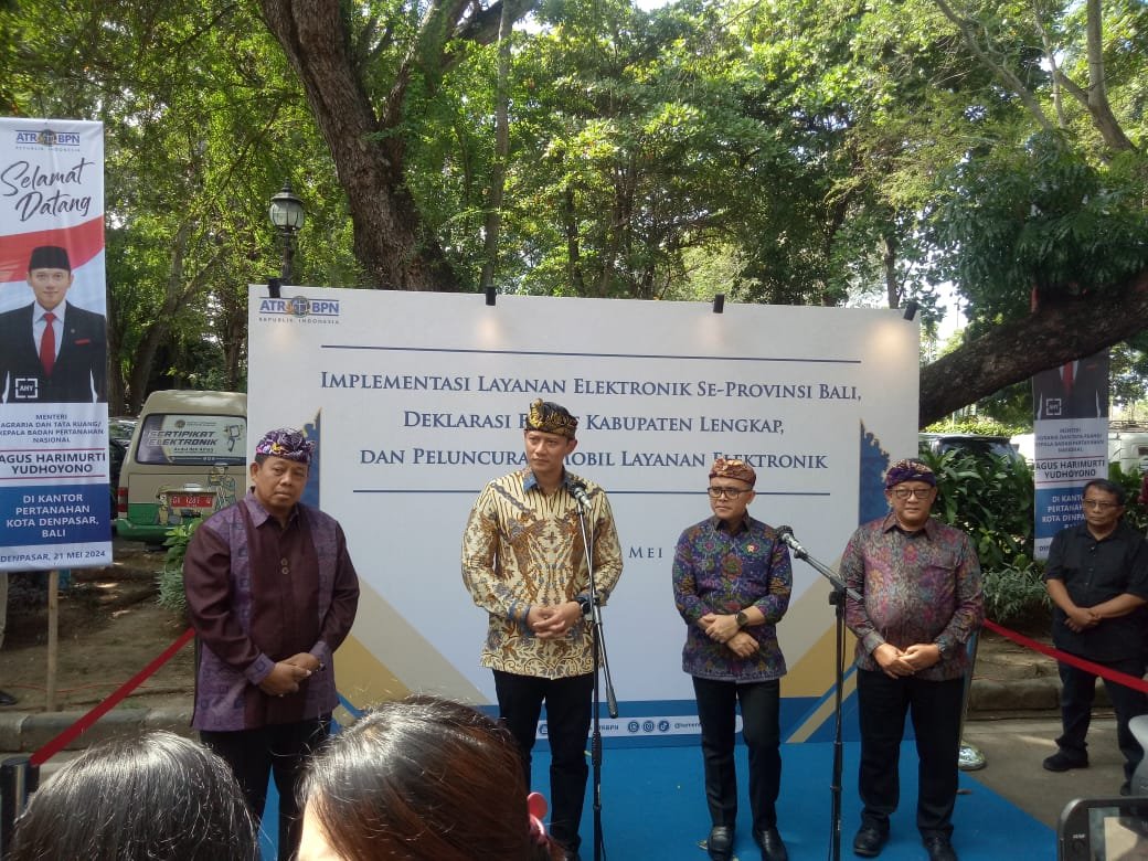Foto: Menteri Agraria dan Tata Ruang/Badan Pertanahan Nasional (ATR/BPN) Agus Harimurti Yudhoyono (AHY) mendeklarasikan empat kabupaten di Provinsi Bali sebagai Kabupaten Lengkap di Wisma Sabha Kantor Gubernur Bali Denpasar,Selasa (21/5/2024). (Sumber: BB/Rian).