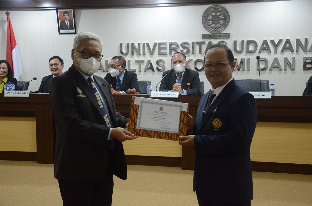 Pada kesempatan ini Promotor yakni Prof. Dr. I Wayan Gede Supartha, SE, SU, memberikan penjelasan singkat mengenai makna disertasi setelah penyerahan sertifikat kelulusan kepada promovendus. (BB/501/rls)