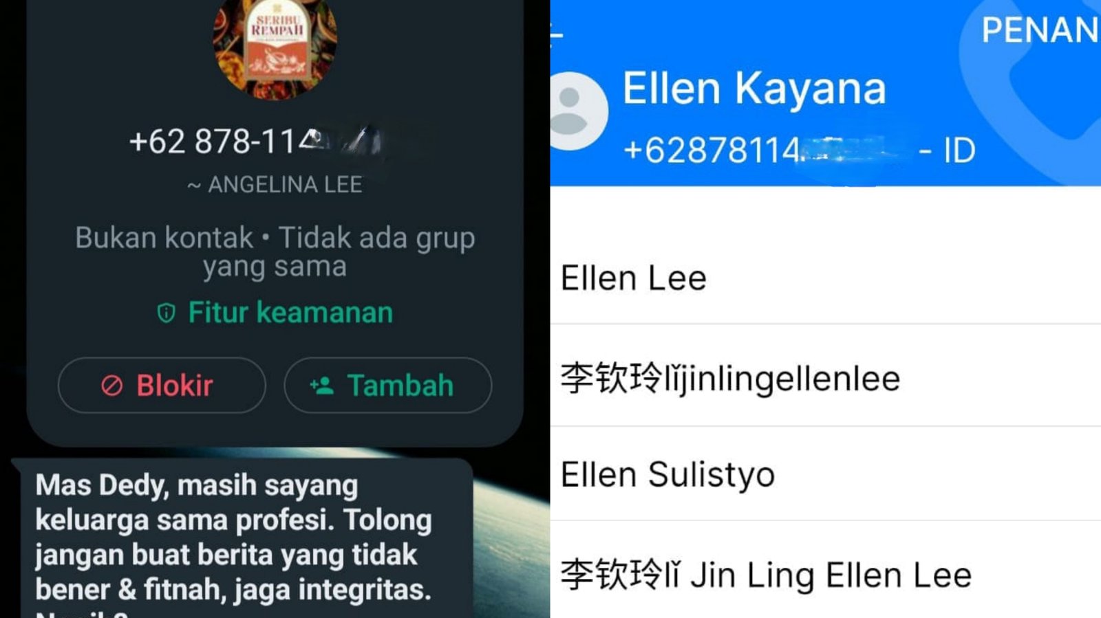 “Mas Dedy, masih sayang keluarga sama profesi. Tolong jangan buat berita yang tidak bener & fitnah, jaga integritas. Nggih?.” Itulah tulisan pesan yang dikirim orang yang tidak dikenal memakai nomor +62 878-1149-7309 tertulis nama Angelia Lee pada Kamis (21/3/2024) pukul 12.05 WIB.