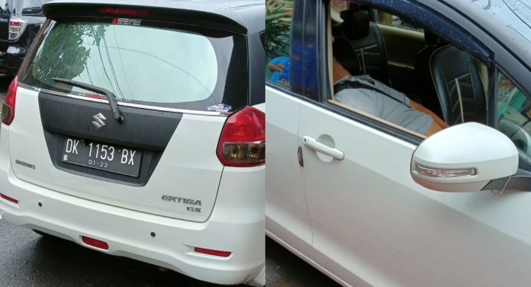 Foto kolase: Kondisi mobil dan jenazah Ketut Sunada (62) yang ditemukan dalam mobil Suzuki Ertiga DK 1153 BX di Jl. Gn. Kawi No. 49 Denpasar, Selasa (29/11/2022) pukul 12.30 Wita. (istimewa)