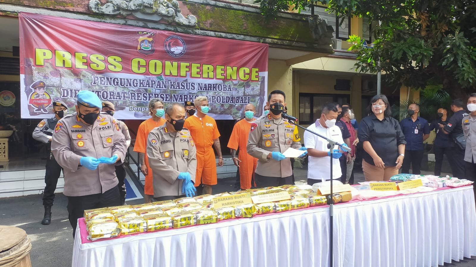 Foto: Kapolda Bali Irjen Pol Putu Jayan Danu Putra merilis pengungkapan kasus narkotika 36 Kg di halaman Ditresnarkoba Polda Bali, Selasa, (12/4/2022).