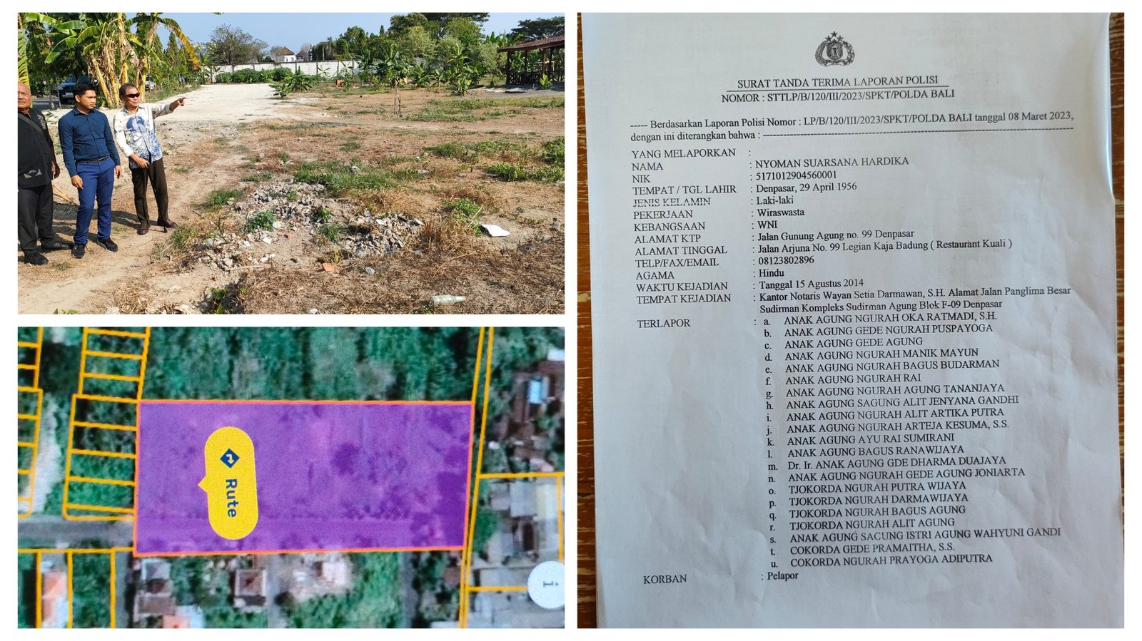 Kolase: Nyoman Suarsana Hardika (Nyoman Liang) ditemani Kuasa Hukum I Made Dwiatmiko Aristianto di lokasi tanah sengketa di Jalan Badak Agung (kiri), peta lokasi tanah sengketa (kiri bawah), dan Laporan Polisi terhadap 21 Pangempon Laba Pura Merajan Satria (kanan). (BB/Ngurah Dibia)