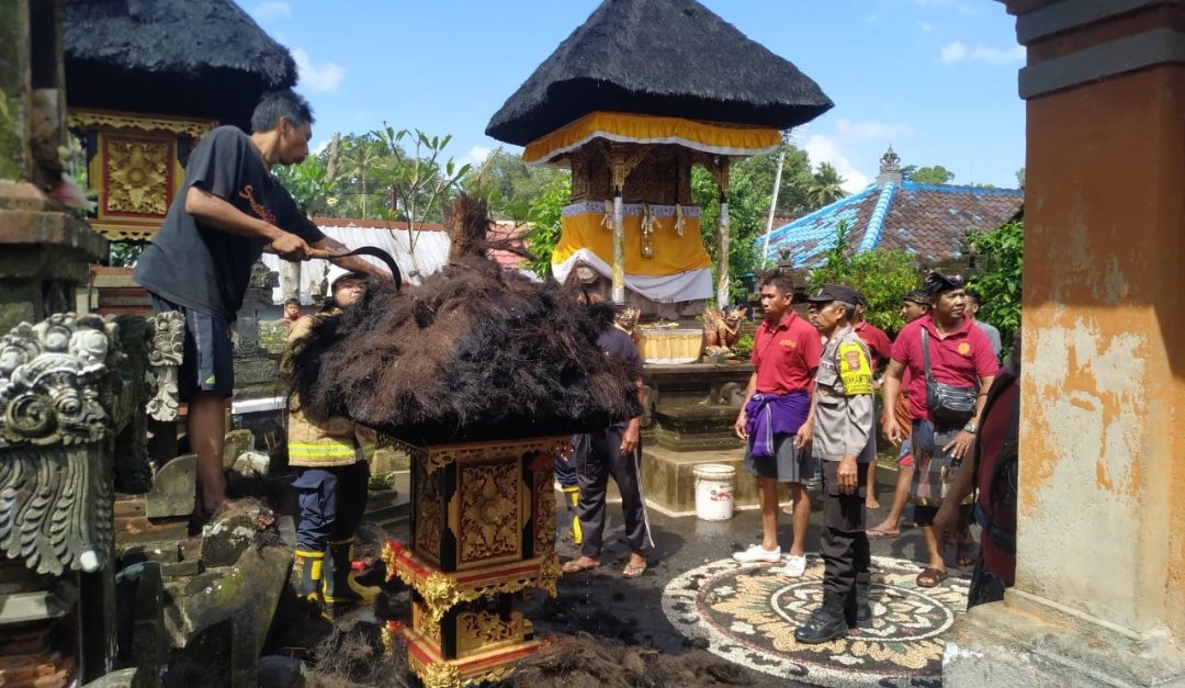 “Akibat kejadian dua atap palinggih terbakar, untuk penyebab kebakaran masih dalam penyelidikan,” tutup Kapolsek Sudarma.