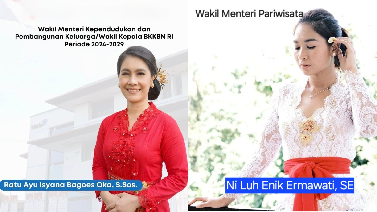Kolase foto: Ratu Ayu Isyana Bagoes Oka (kiri) sebagai Wakil Menteri Kependudukan dan Pembangunan Keluarga/Wakil Kepala BKKBN, sementara Ni Luh Enik Ermawati (kanan) akrab disapa Ni Luh Puspa, menjadi Wakil Menteri Pariwisata. (barometerbali/instagram)
