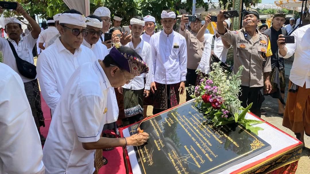Foto: Gubernur Bali Wayan Koster didampingi Walikota Denpasar dan Bandesa Adat Kesiman menandatangani prasasti peresmian wantilan Segara Padanggalak, Denpasar Timur, Jumat (14/3/2025). (barometerbali/rah)