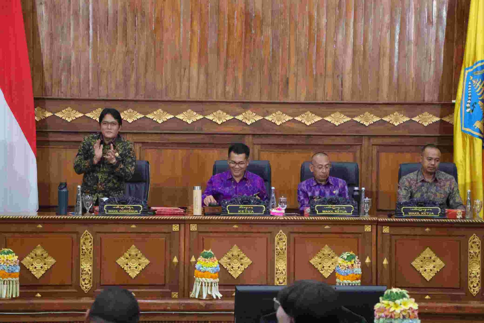 Gubernur Bali dalam sambutannya yang dibacakan oleh Wakil Gubernur Bali, I Nyoman Giri Prasta, saat Sidang Paripurna DPRD Bali di Gedung Wiswa Sabha Utama, Selasa (28/10), menyampaikan terima kasih dan apresiasi atas kerja keras serta kerja sama seluruh pihak dalam pembahasan empat Raperda tersebut.